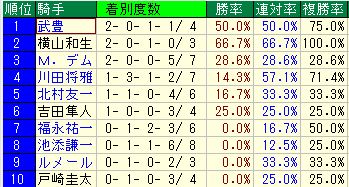 ここで注目したいのは川田騎手【1.3.1.2】の成績です。